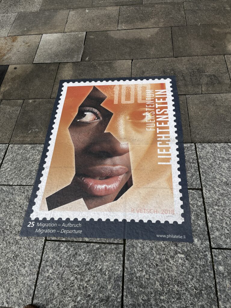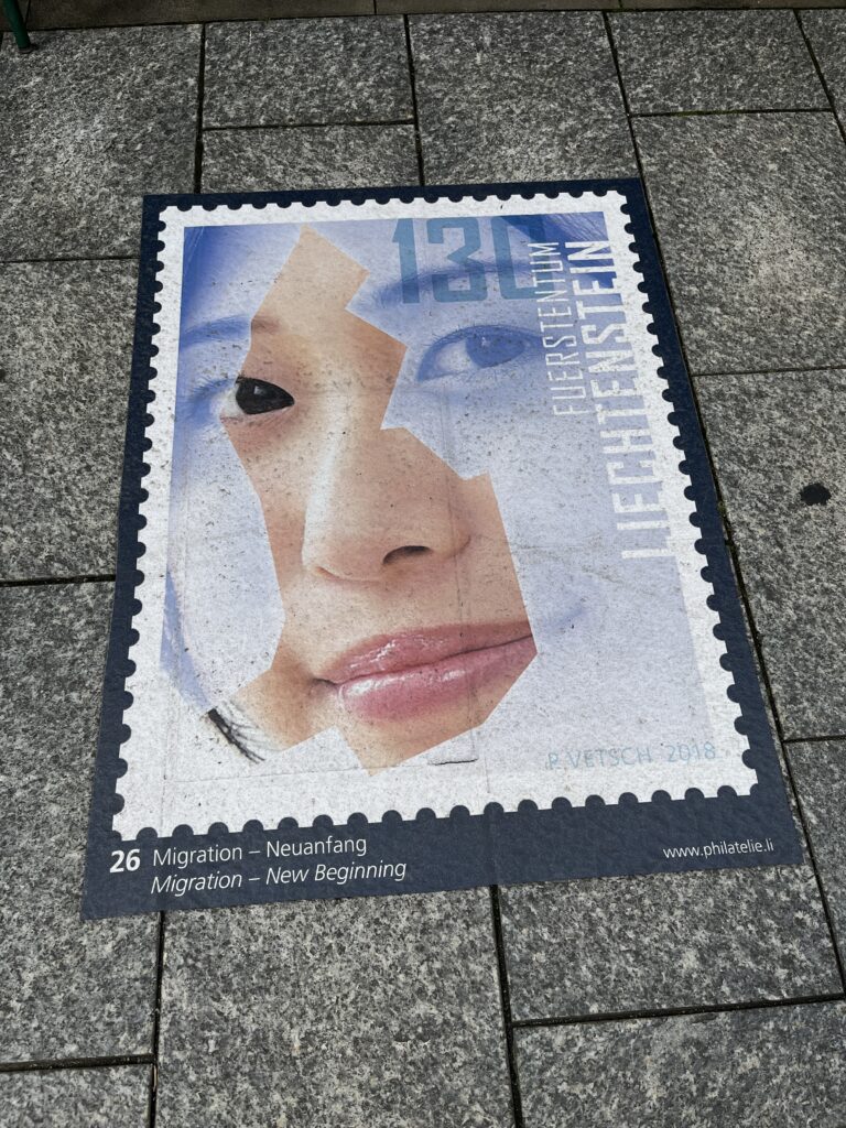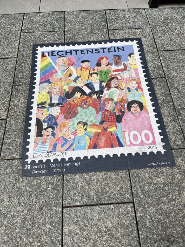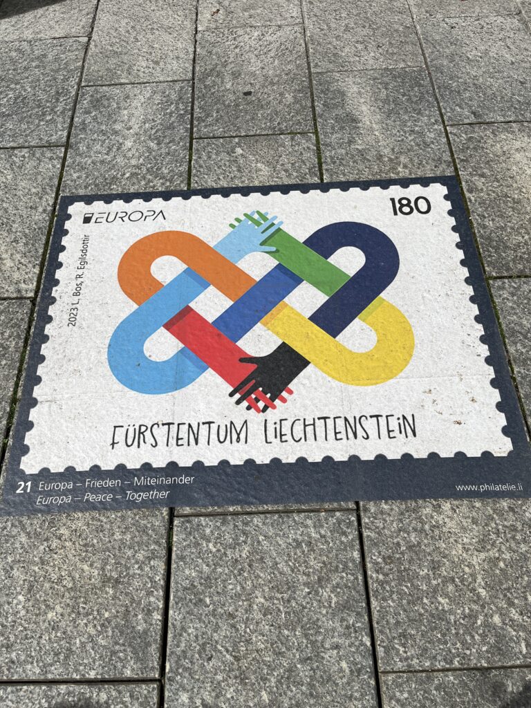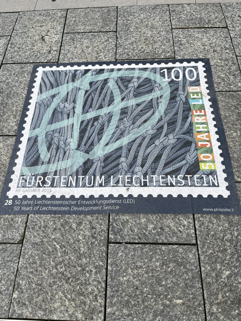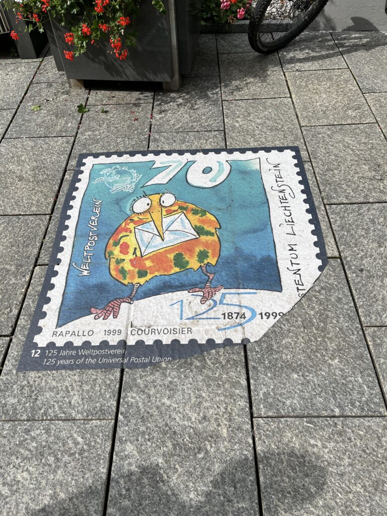 Lichtenstein is rather famous among numismatic circles. Here are a few examples of their stamps – laid out on the sidewalk in poster size.
