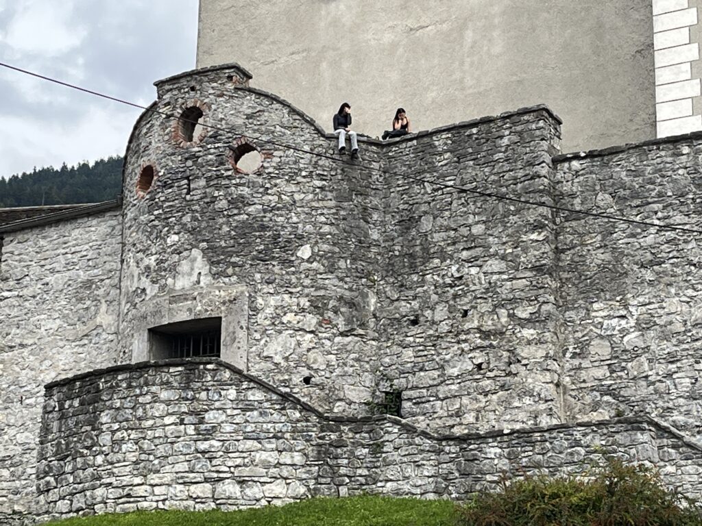 We noticed the two girls sitting high on the wall of the neighboring church.