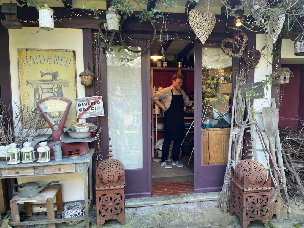 Along the way we learned much about Andrea and his life and dreams (wants to move to Montana). He is an avid hunter. He even brought out some pheasant feathers and a frozen woodcock to highlight stories. His aunt spoke very little English – just enough to regale us with the tale of his call for HELP when this dinner was scheduled during a time when his wife and mother were visiting her mother in Sicily.