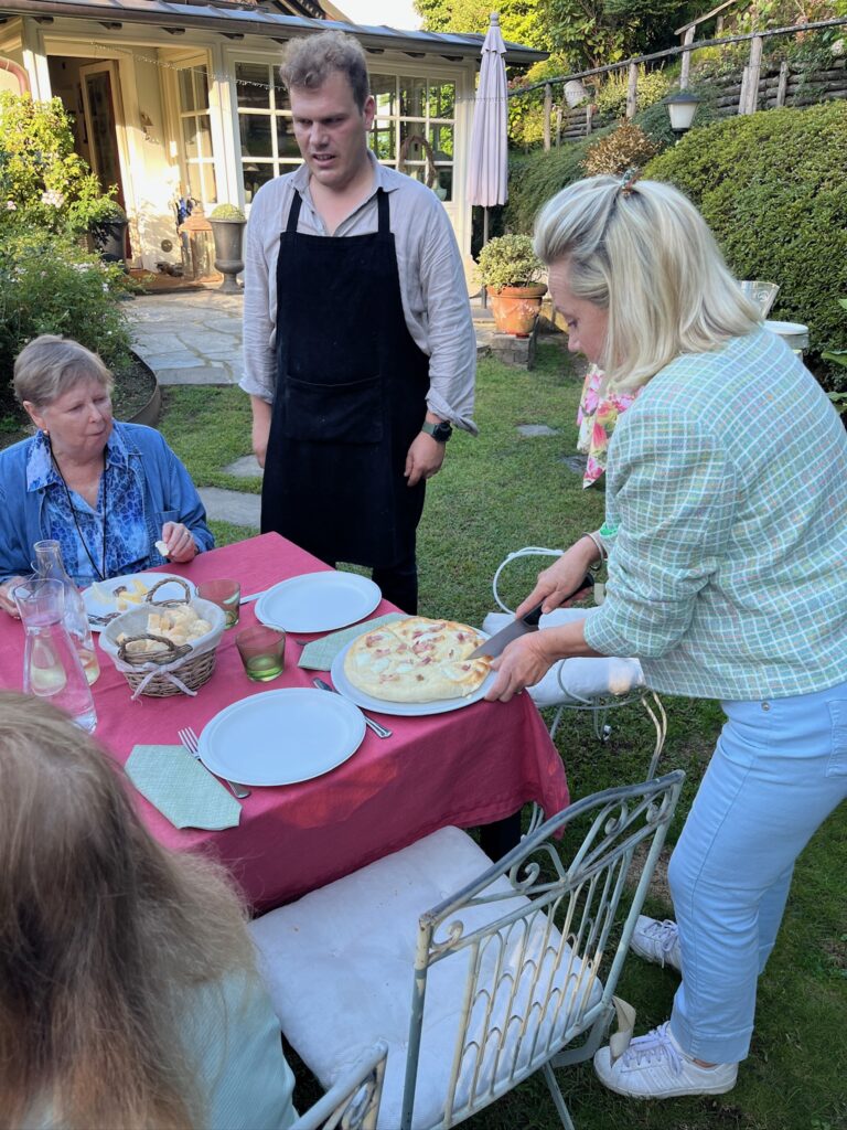 While he and I were attending to the pizza appetizer in his outdoor kitchen his aunt was serving cheese and salami. We brought back the first of 3 pizzas and dug in. Along the way he produced the next two pizzas and a pan of potatoes and onions that also cooked in his pizza oven.